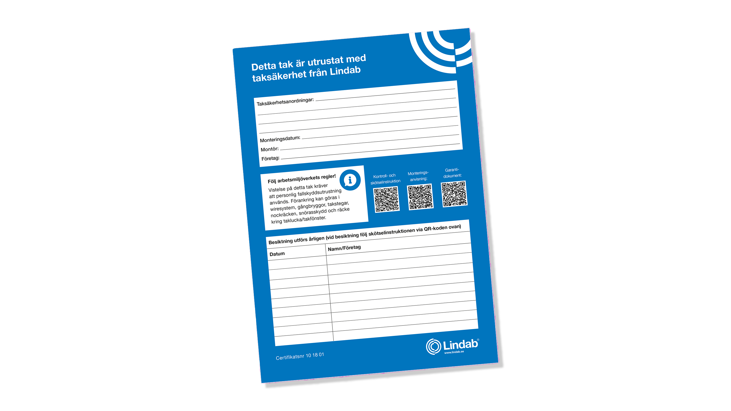 Skylt i A4-storlek att fästa på byggnad där Lindabs taksäkerhet sitter monterad.
