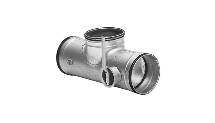 Uppbyggt av ett förlängt T-rör och två sammanlänkade DTU-spjällblad.